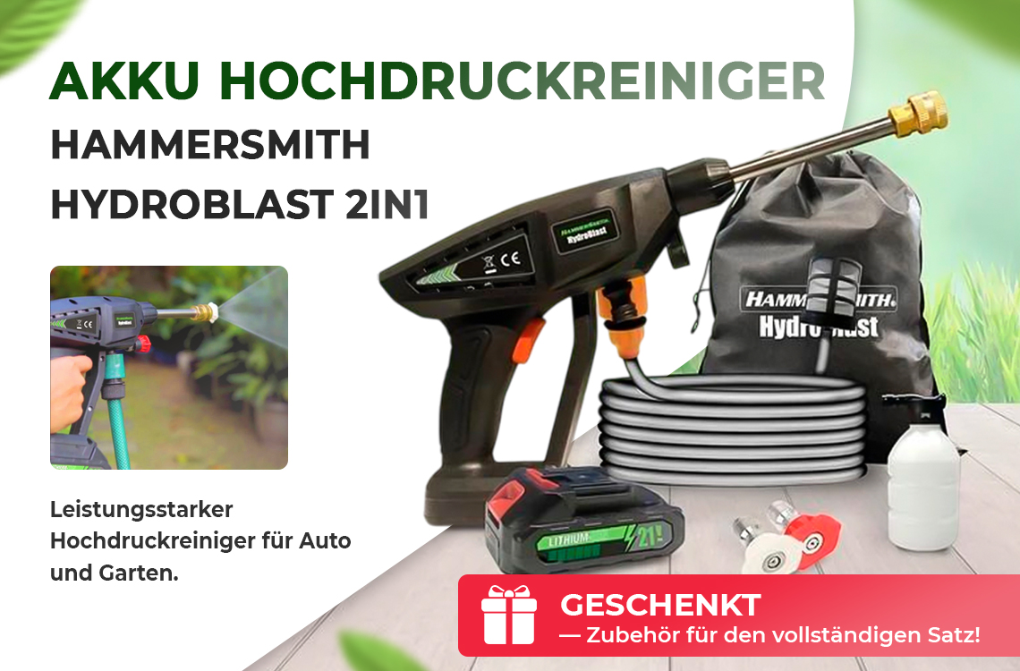 Herkömmliche Hochdruckreiniger sind oft sperrig, kabelgebunden, teuer und verbrauchen viel Strom. Die Lösung: Hammersmith HydroBlast. Dieser Akku Hochdruckreiniger ist ein kompaktes und leichtes Handgerät mit gerade mal 1,4 kg. Mit einem Wasserdruck von bis zu 7 bar kommt er mit jedem Schmutz zurecht - auch dort, wo sperrige Hochdruckreiniger nicht hinkommen!